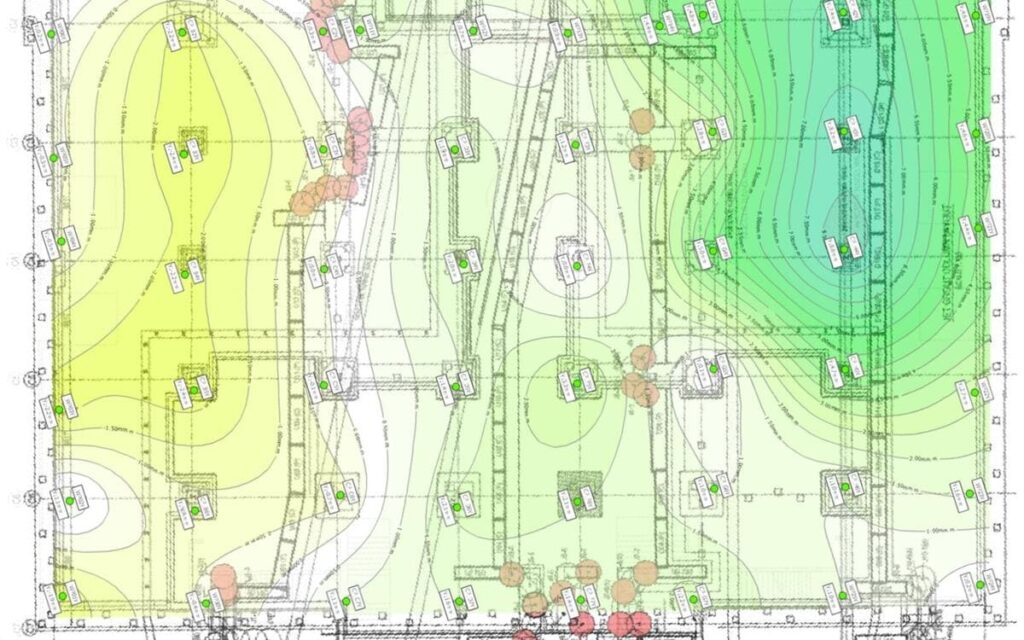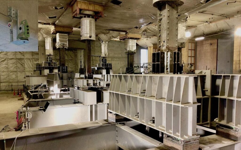 The main challenge when conducting real time 3D survey monitoring in a closed environment is to find stable (unmoving) reference points. The challenge was overcome with the deployment of a network of 7 Total Stations (Cyclops) and the “”Evolution”” algorithm. This patented data processing module allows for linking the Cyclops together and then passing the reference information from one to another. A set of stable reference prisms was then installed outside the building and used to successfully monitor the movements of the interior columns structure during load transfer and excavation.