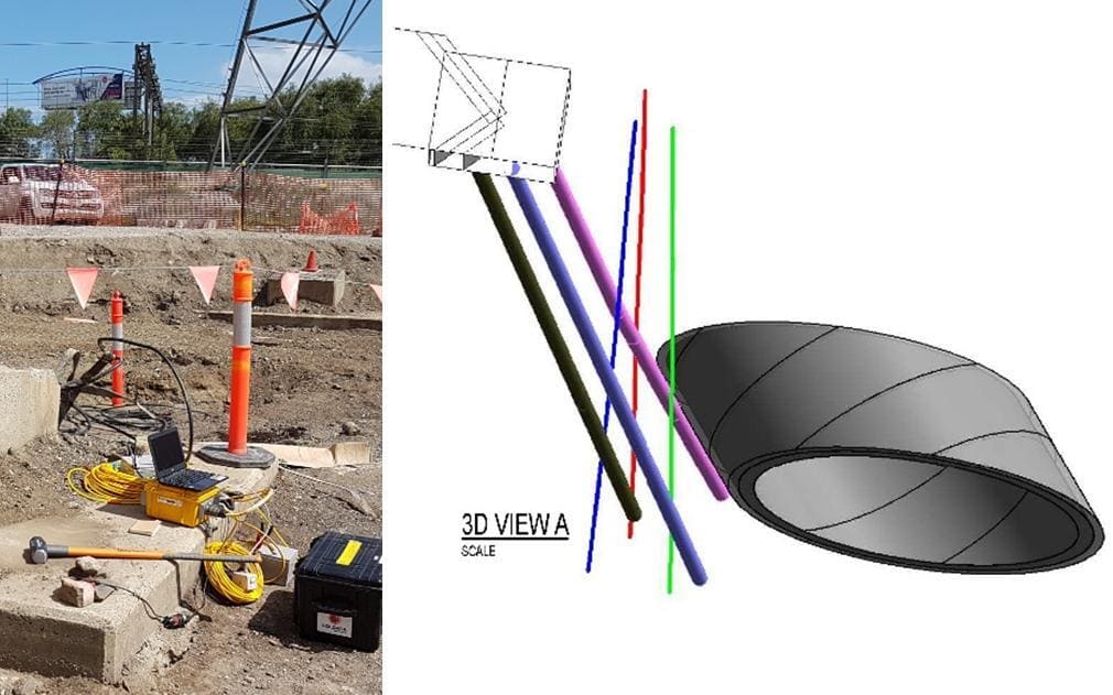 The expected clearance between the existing foundation and the future tunnel excavation is less than 1m for some of the piles. Three geophysical methods – seismic, magnetic &  electromagnetic – were successfully used to accurately locate the raking piles and precisely determine the clearance.