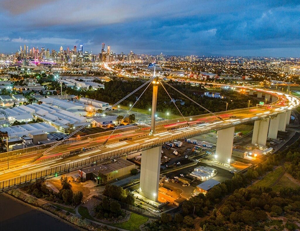 The West Gate Bridge is an iconic structure of the Melbourne landscape, spanning the Yarra River just north of its mouth into Port Phillip. It is a vital link between the inner city and Melbourne’s western suburbs with the industrial suburbs in the west and with the city of Geelong, 80 kilometers to the south-west. It is one of the busiest road corridors in Australia. A decade ago, the bridge was expanded to 2 x 4 lanes to accommodate growing traffic.